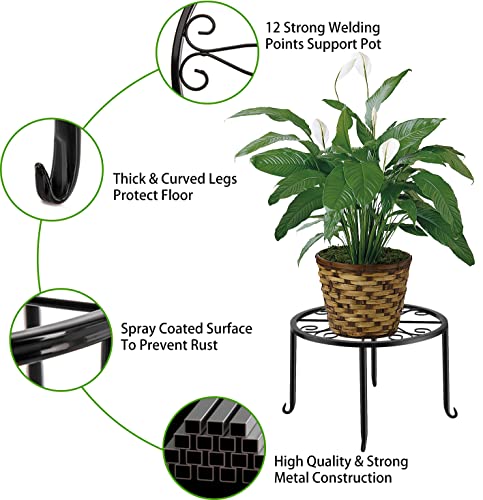 Product Description Package: Round Plant Stand x 5 Plant Stand 1: 10.8 x 10.8 x 7 inch Plant Stand 2: 9.8 x 9.8 x 6.1 inch Plant Stand 3: 8.8 x 8.1 x 5.1 inch Plant Stand 4: 7.9 x 7.9 x 4.1 inch Plant Stand 5: 6.9 x 6.9 x 3.1 inch Specifications: Material: 100% Metal Flaparte 5 Pack Metal Plant Stands for Flower Pot, Heavy Duty Planter Holder Provide an elegant way to display your favorite potted plants in a chic style.These plant stands are made of high-strength metal, not easily deformed, welded from high quality iron, very durable and sturdy, perfect for heavy plants pots or other planter. Select high-quality metal, all products are thickened with anti-rust raw materials to ensure greater carrying capacity.Suitable for most occasions - Bedroom, living room, balcony, of course it is also suitable for gardens to carry large plant pots. Suitable for Indoor & Outdoor, Don't Worry About Rain & Snow Weather Potted Plant Stands Details: Elegant and neat design can be used to decorate your garden, balcony, living room, and officeThe planter holder is made of high-quality cast iron, only with high-quality welding process, not easy to deform, very durable and strongThick, curved legs protect the floor from damageBlack anti-rust coating is perfect for outdoor and indoor plants