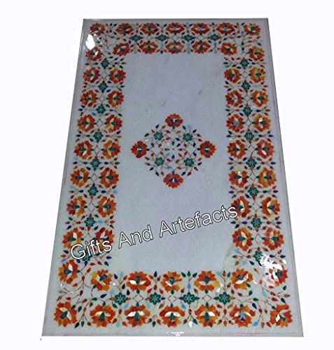 Gifts And Artefacts 24 x 48 Inches Carnelian Stone Inlay Work Center Table Top for Home Furniture Rectangle Shape White Marble Dining Table