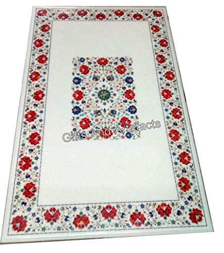 Gifts And Artefacts 36 x 72 Inches White Marble Rectangle Shape Dining Table Top Floral Pattern Inlay Work Kitchen Table for Home Decor