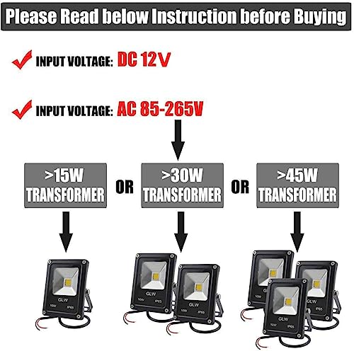 - 10W Comfortable Bright Flood Lights Outdoor : 3000K warm white light can display you a cozy atmosphere.Input voltage is 12V AC or DC, very safe to install and use.If use it to 110v AC voltage, a 12v transformer needed.