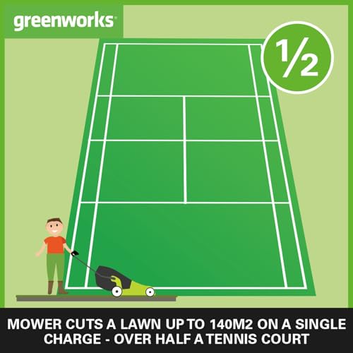 - CUTS SMALL SIZED LAWNS UP TO 140m² ON A SINGLE CHARGE - delivering all the power and performance of a petrol driven mower without the mess, noise and environmental impact, the mower has a brushess motor for reliability, low maintenance and a longer life