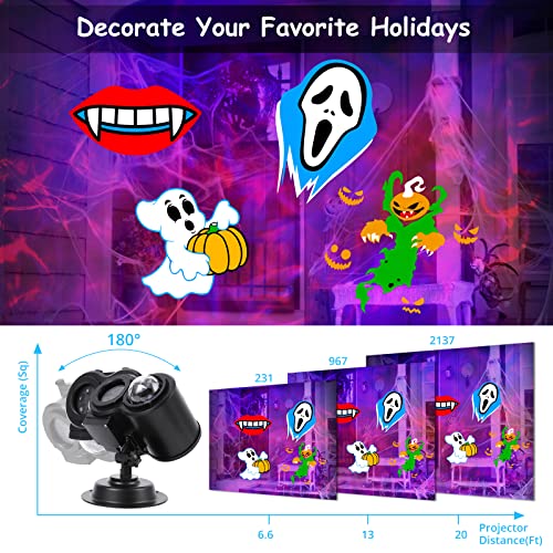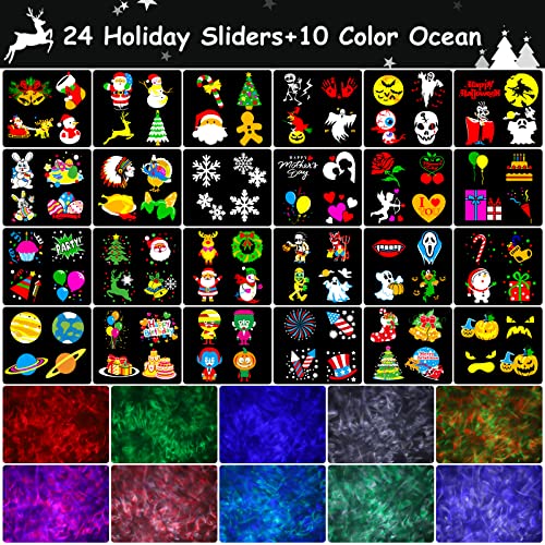• 【 2-In-1 Holiday Projector Lights 】: This Halloween projector lights equipped with 2 projection heads, one for 24 slide patterns and the other for RGBW 10 colors ocean-wave ripple effect. You can choose slide patterns or water wave effect only, or combine slide patterns with ocean waves, more choice for you to create the atmosphere you want.