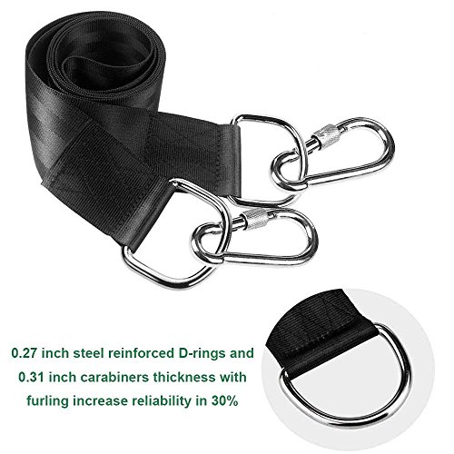 - 【The Ultimate in Safety】 Our versatile, CE-certified swing straps are the same quality and strength as seat belts. Each strap has double box stitch on the metal ring fabric loops to provide sturdy and reliable attachment without tearing apart at the seams,which makes straps much stronger. 0.27 inch -D-rings and 0.31 inch carabiners thickness with furling increase reliability in 30%. The included 1 x 304 stainless steel swivel/spinner also can holds up to 2800lbs