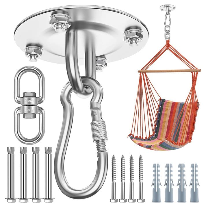 • Ceiling Hook for Swing: Contains 1pc*swing swivel hook, 2pcs*expansion screws, 2pcs* screws, 1pcs* carabiners, 2* Plastic plug, The 360° rotate hammock hooks for the ceiling kit can load up to 450kg with a high load capacity, very great for hanging the hammock chair, swing, punchbag, and yoga strap to indoor and outdoor relaxation. Can also be used for hanging heavy objects in the garage