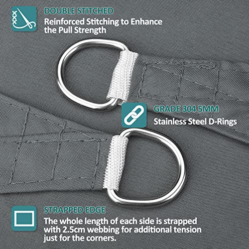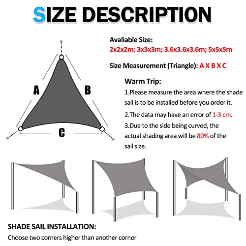 - PREMIUM FABRIC: Our shade sail is made of 100% polyester fabric with a 160 gsm PU coating, which makes it both healthy and safe to use. It's highly resistant to water, tears, and adverse weather conditions, making it perfect for long-term use. The shade sail comes with three pad eyes, and we're giving away three 1800D wind ropes (200cm for each) for easy installation. It features sturdy sewing on each side and stainless steel D-rings on each edge to ensure a secure installation