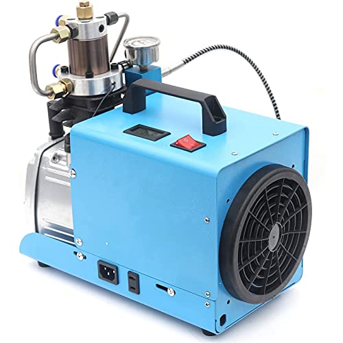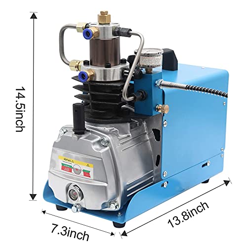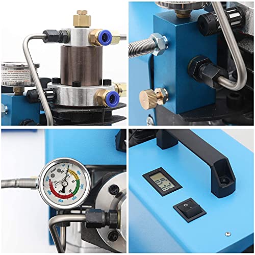 - HIGH EFFICIENCY: This electric high pressure air comressor is 1800W, therefore it has a powerful performance during work. The normal inflating speed is 2800r/min, working pressure level is 4500PSI/30MPa, easy to fill up your container in a very short period of time. Current working pressure is showed through pressure gauge.