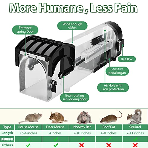 - 🐭Best choose: We are confident in our humane mice trap! This indoor reusable humane mouse-trap won't pose any harm to anyone in the household and your satisfaction is our top priority. IAGORYUE will provide 30 days worry-free return. If you have any questions, please contact with us, we will send professional service personnel to provide timely after-sales service.