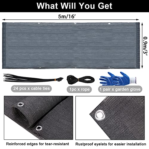 - Package: 1pc balcony sunshade net, 24pcs cable ties, 1pc rope, 1pair gloves. The thickened shading net size about 5 m x 90 cm/196.85 inch* 35.43 inch (L*W).