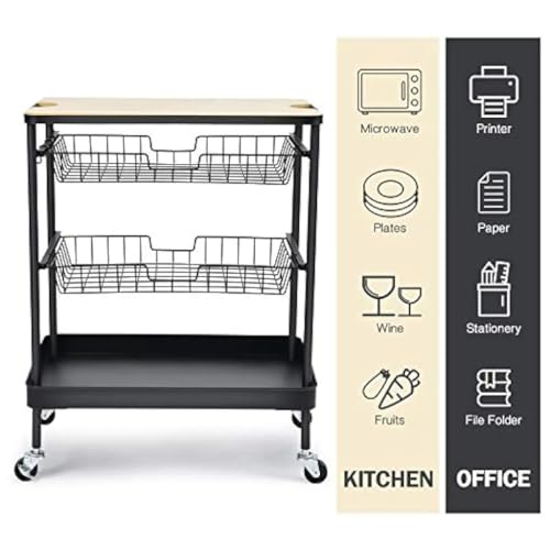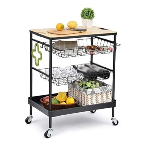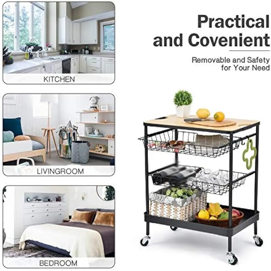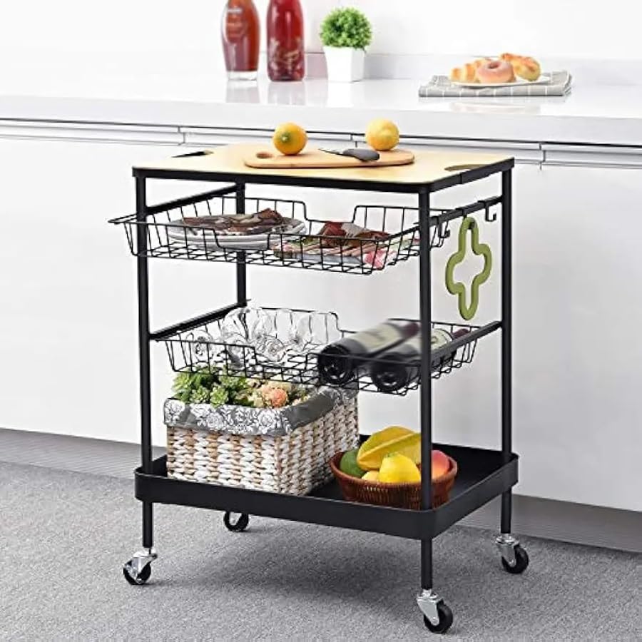 - Featured a wood table and 3-tier storage layers and 3 hooks. The tabletop provides extra counter space for kitchen appliances or cutting board. The 2nd/3rd basket drawers can be pulled out to store.