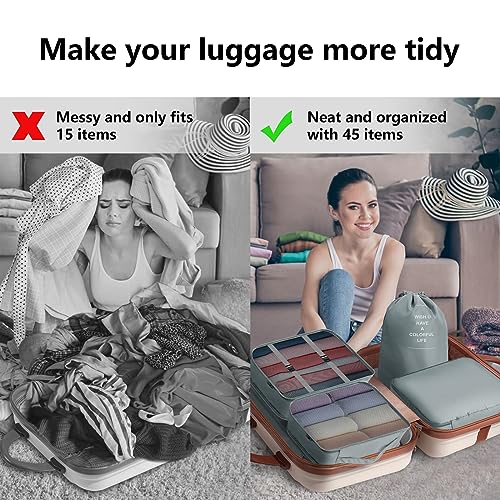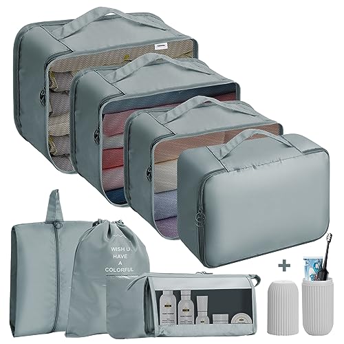 Product Description Perfect for travel and home The 9-piece packing cubes will fit in most airline cases, tote bags and backpacks. Ideal for business trips, family ,holidays and camping. You can also use it as a storage bag in your home. Suitcase Organizer is made of high quality nylon fabric, waterproof and tearproof. Double premium metal zipper very sturdy. The garment bags have their own carrying handle for easy transport. They can be easily folded when not in use and they can save your space. Packing Include: Large mesh pocket: 40 * 30 * 12 cmMedium mesh pocket: 33 * 28 * 12 cmSmall mesh bag *2: 30 * 22 * 12 cmShoe bag: 35 * 20cmDrawstring bag: 35 * 27 cmToiletry bag: 26 * 16 * 7cmFlat bag: 25 * 16 cmToothbrush cup: 19 * 6 cm Packing Cubes for Clothes Large:10-12 shirts Medium:7-9 Shirts Small: 5-6 shirt Underwear Bag Separating your bras and underwear with other clothes and keep them from deformed Laundry Bag Separating the dirty or wet clothes with the clean ones. Toiletry bag Packing Cubes Large Capacity to keep all your toiletry goods.
