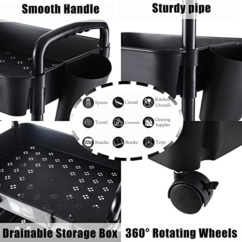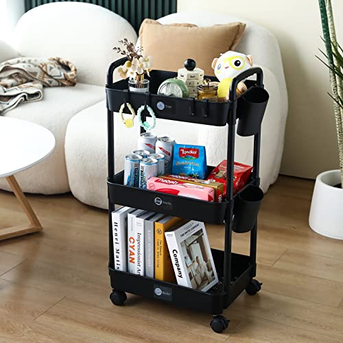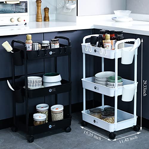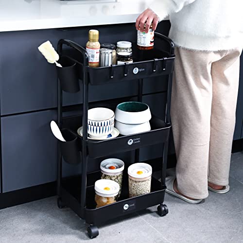 KOAODA 3-Tier Storage Trolley on Wheels, Kitchen Rolling Utility Cart Storage Organiser with Handle Hanging Cups for Office, Kitchen, Bedroom, Ba