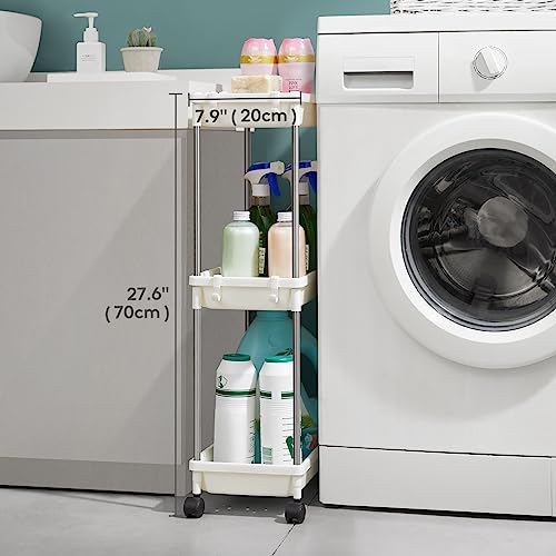 - Narrow Space Organization: This 3-tier slim storage trolley's width is 7.9 inches, which is ideal for keeping narrow space organized. Make smart use of the gap between refrigerator and wall, toilet and wash basin, or washer and dryer to maximize space.